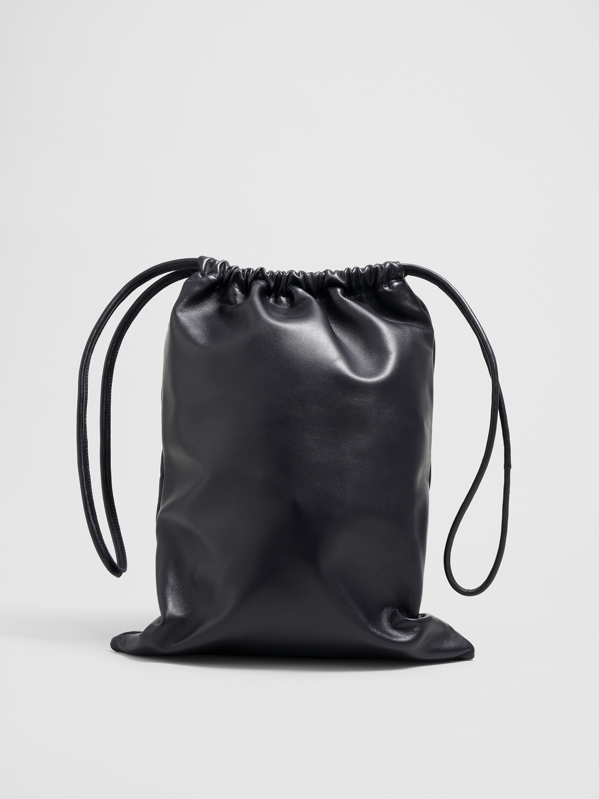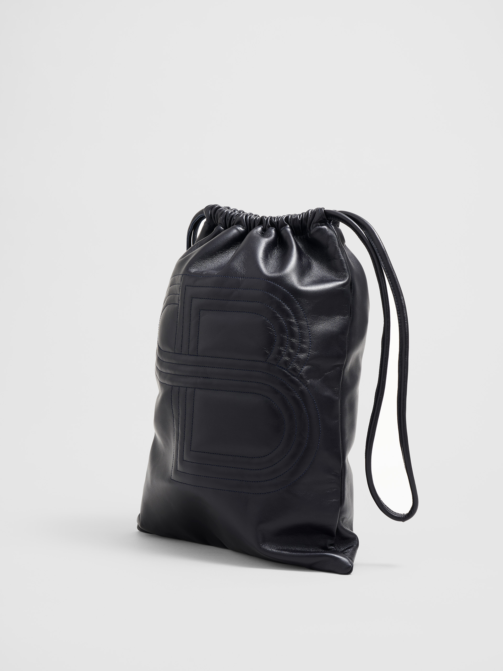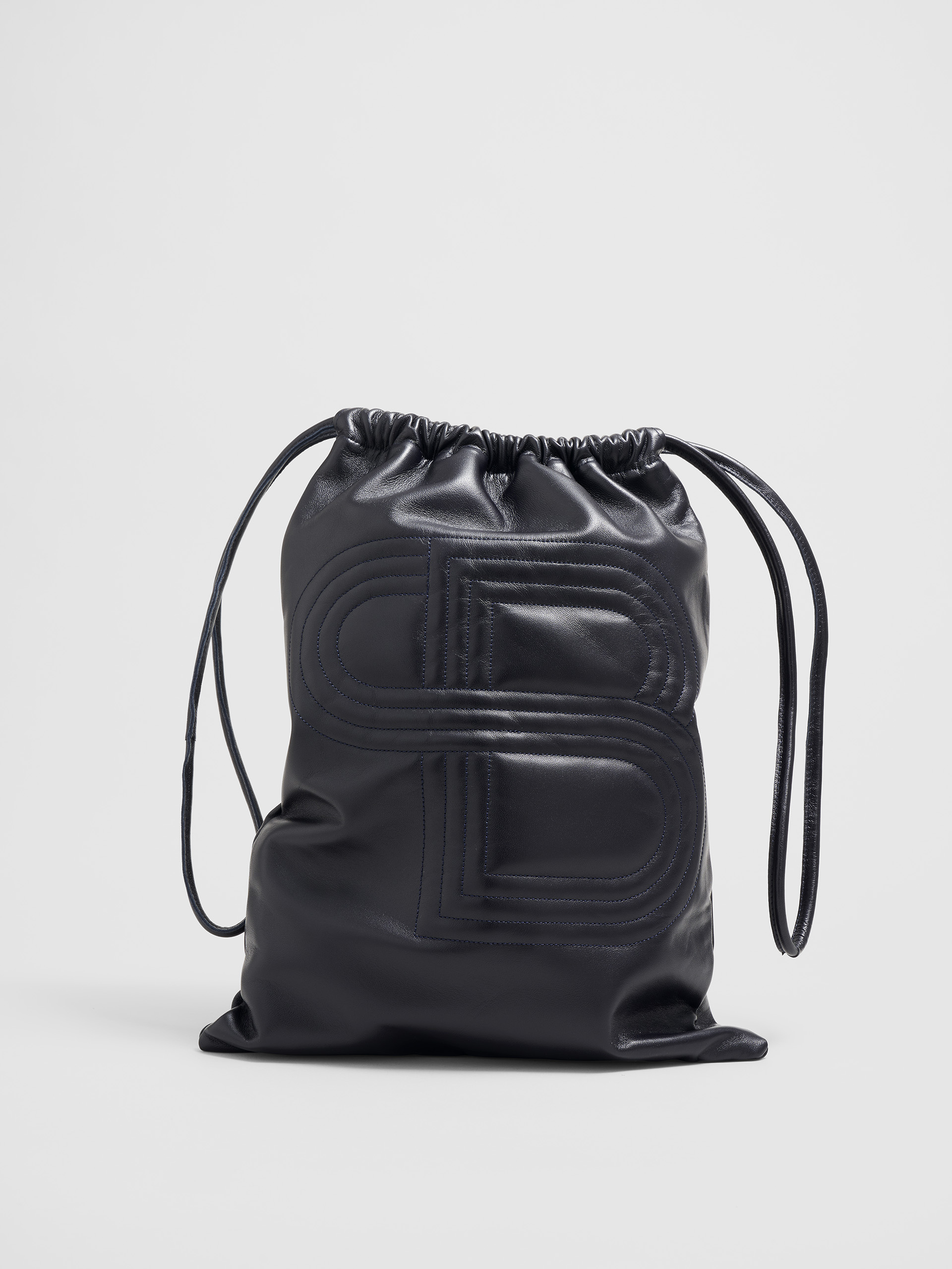 EXTÉRIEUR :  Agneau plongé bleu nuit, insigne de la marque brodé ton sur ton, lacet en cuir